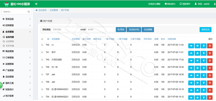 会员管理系统,查看管理小程序会员,可以进行模糊查询会员。